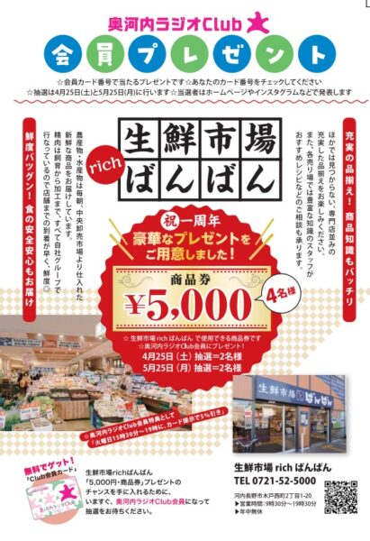 生鮮市場ばんばん 商品券4月分2名様の当選番号を発表いたします。
